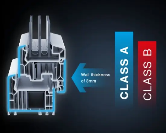 Class A profile to DIN EN 12608 with an outer wall thickness of 3 mm and 2.7 mm walls in the rebate and connection area (tolerance ±0.2 mm in each case)