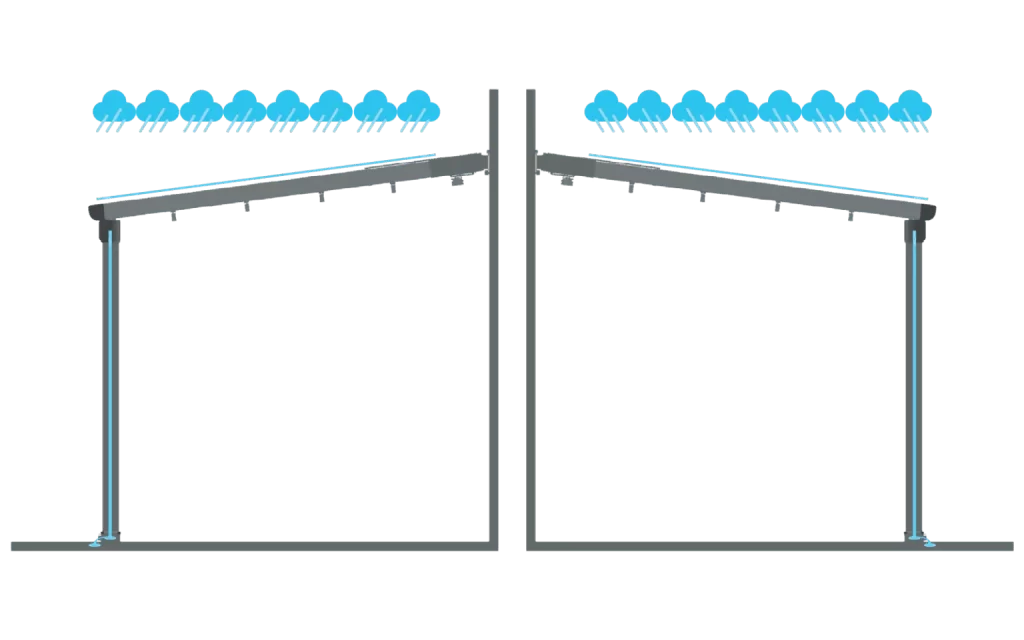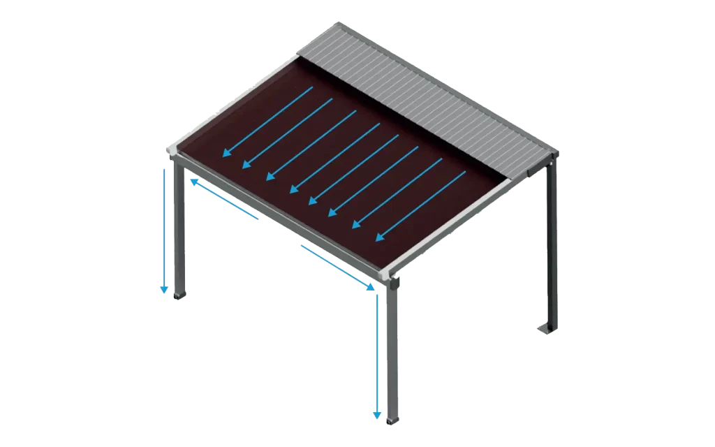 A specially developed horizontal gutter profile is integrated into the front beam, discreetly collecting rainwater as it flows along the inclined roof surface. The system then channels the water efficiently through a concealed drainage network, directing it away from the structure for a clean and controlled finish. With SkyFlow, performance meets design—offering a refined pergola solution that not only looks minimal and elegant but also performs flawlessly in all weather conditions.