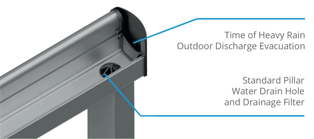 Water management is a critical aspect of any outdoor structure, and the Classic Pergola excels in this area with its advanced drainage system. The pergola features a pioneering “Discharge Evacuation” solution, exclusive to Sunset, which efficiently channels rainwater through specially designed pillar water drain holes and drainage filters. These elements work together to prevent water pooling and leakage, ensuring a dry and comfortable space underneath, even during heavy downpours. This next-generation water evacuation system sets the Classic Pergola apart from standard models and reinforces its reputation for technical excellence.
